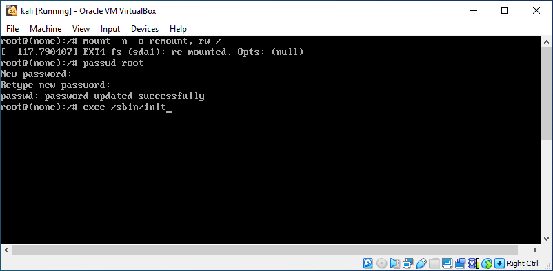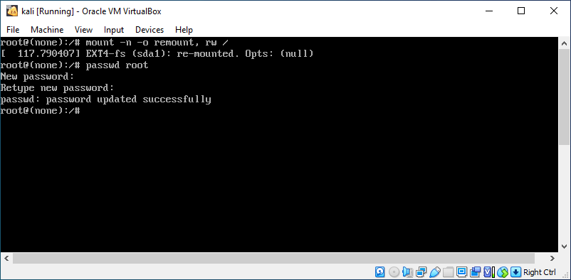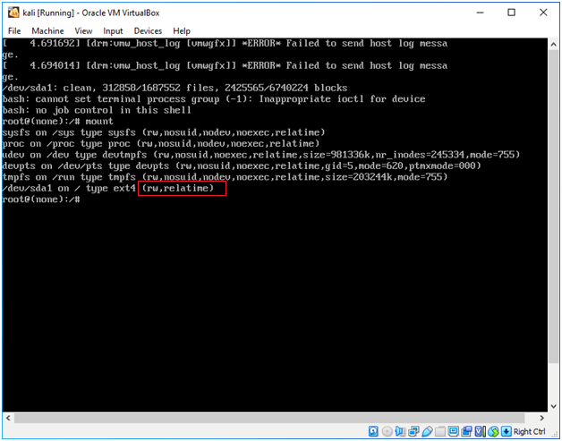 Para comprobar el permiso de escritura en la partición raíz, pulsamos la tecla “F10”. Después de esto, se abrirá un mensaje en el que utilizaremos el comando “mount” para asegurarnos de que el permiso de escritura se haya concedido correctamente.