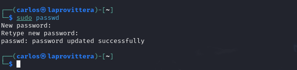 Si utilizamos una versión anterior de Kali Linux (anterior a 2020.1), nuestra credencial predeterminada es “root” “toor”. Por otro lado, si utilizamos versiones más nuevas de Kali Linux, la credencial predeterminada es “Kali” “Kali”. Necesitamos realizar una modificación lo antes posible. Es simple. Todo lo que tenemos que hacer es ejecutar el siguiente comando en nuestra terminal de Kali Linux.