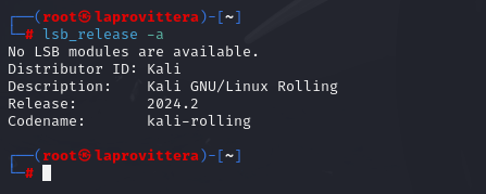 Método 2: En este método, utilizaremos el comando lsb_release -a para comprobar la versión de lanzamiento, la descripción y el nombre en código del sistema operativo. Esta es la forma más rápida de averiguar qué versión de Kali estamos utilizando.