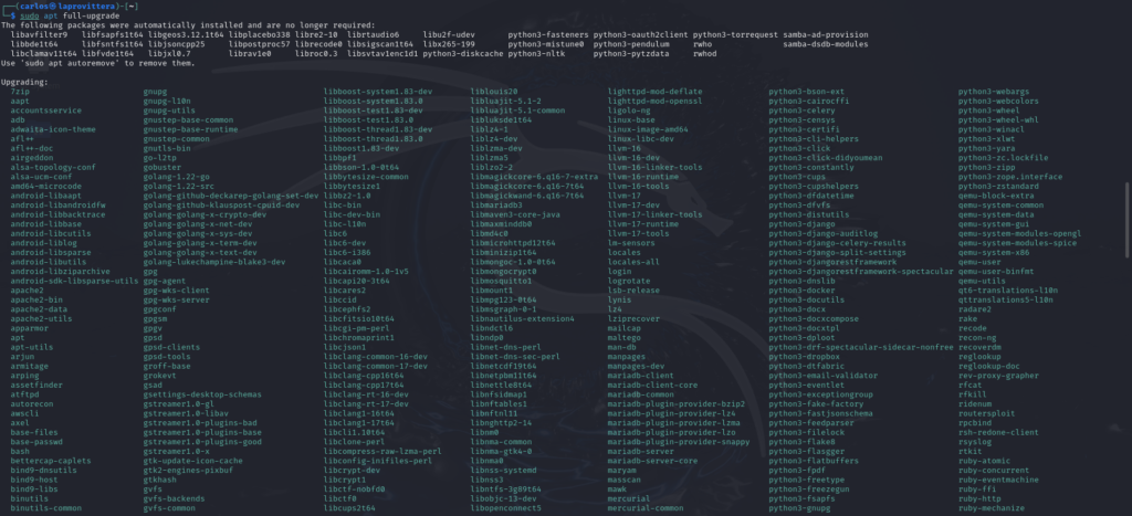 Mientras que el comando sudo apt upgrade -y instala todos los paquetes sin eliminar ninguno y omite la actualización de paquetes antiguos si es necesaria su eliminación, el comando sudo apt full-upgrade -y elimina los paquetes antiguos si es necesario actualizar los paquetes a sus versiones más recientes.