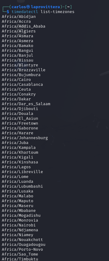 Necesitamos utilizar la siguiente sintaxis para establecer la zona horaria del sistema una vez que hayamos seleccionado la zona horaria correcta de la lista.