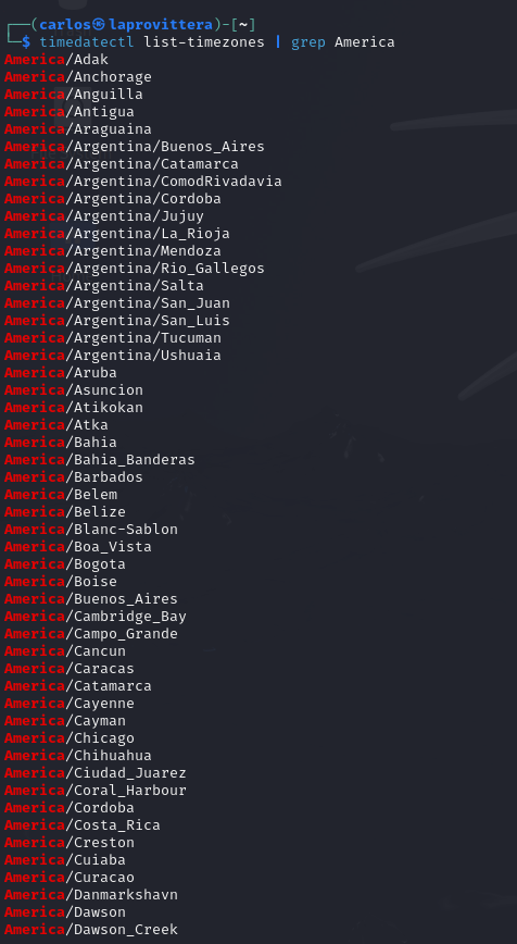 Para acotar la búsqueda, podemos utilizar el comando grep. Este comando proporcionará una lista de todas las zonas horarias posibles en America, como se muestra en el siguiente ejemplo: