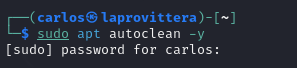 El comando sudo apt clean -y limpia el repositorio local de los archivos del paquete que recibimos. Elimina todo excepto el archivo de bloqueo de /var/cache/apt/archives/ y /var/cache/apt/archives/partial/.