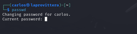 Este sencillo comando nos solicitará la contraseña actual del usuario (que será la predeterminada si aún no la hemos cambiado). A continuación, solicitará una nueva contraseña y la verificará una vez más. Una contraseña segura debe incluir letras mayúsculas y minúsculas , así como símbolos y números. Nuestra contraseña se cambiará después de que la hayamos verificado. Esto se puede ver en la siguiente captura de pantalla: