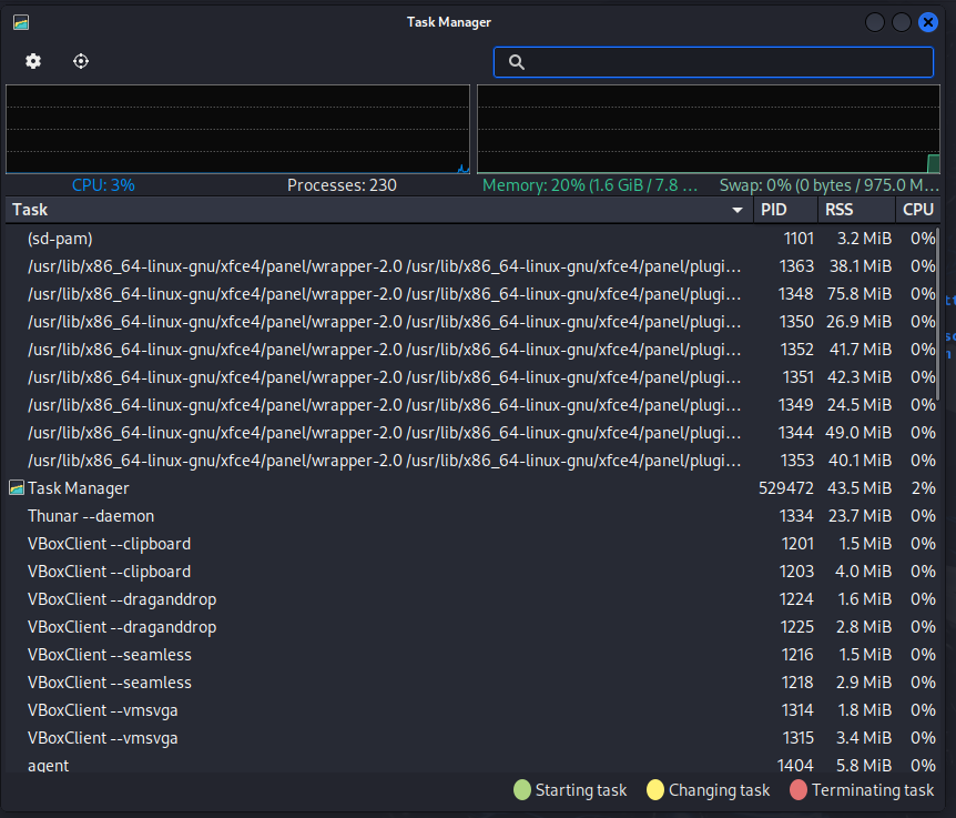 Con la ayuda de las herramientas top (integradas en el sistema) o htop (sudo apt install htop), podemos ver la actividad de monitoreo en tiempo real. Una tarea similar se puede realizar con la herramienta gráfica xfce4-taskmanager .