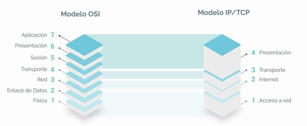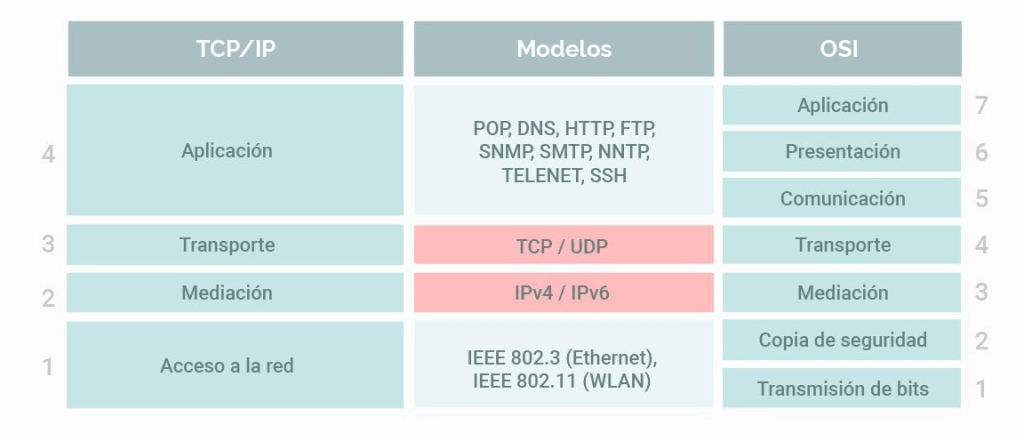 - Modelo TCP/IP: con el protocolo TCP se divide la información en pequeños «paquetes de información» que viajan de forma independiente y se ensamblan de nuevo al final del proceso, mientras que IP es el encargado de encontrar la ruta al destino.