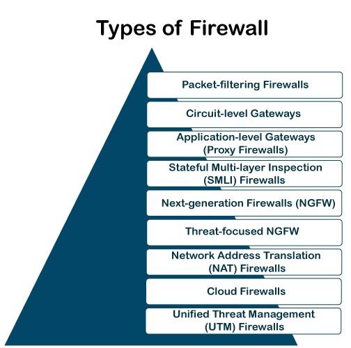 Existen principalmente tres tipos de firewalls, como firewalls de software, firewalls de hardware o ambos , según su estructura. Cada tipo de firewall tiene una funcionalidad diferente pero el mismo propósito. Sin embargo, lo mejor es tener ambos para lograr la máxima protección posible.
