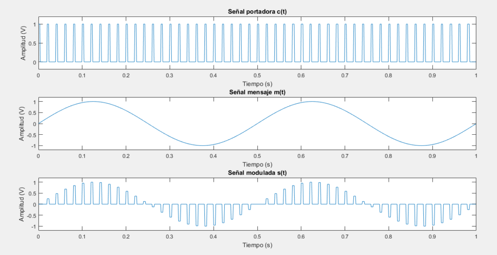 En el dominio del tiempo, se pueden ver las variaciones de amplitud siendo la frecuencia constante. En cambio, en el dominio de la frecuencia, vemos las 3 señales con su amplitud pico y frecuencia. Los cambios de amplitud no son representados