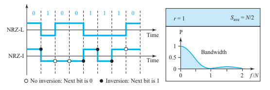 NRZ-I se basa en cambios de polaridad o ausencia. Cuando hay un cambio de polaridad significa que el bit de datos es un 1; mientras que, cuando no hay cambios, el bit de datos es 0. esquemas polares NRZ-L y NRZ-I: