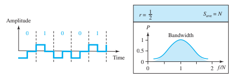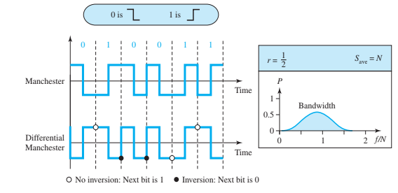 Sin embargo, este esquema requiere dos elementos de señal por elemento de datos, lo que duplica el ancho de banda necesario. La codificación consiste en una transición hacia cero en el medio de cada bit de dato.