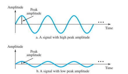 La amplitud es el pico de intensidad que alcanza, el cual es proporcional a la energía que transporta. En la figura, se observan 2 señales, la primera tiene más amplitud que la segunda. La amplitud puede expresarse en voltios (V).