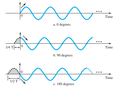 En la figura la primera señal al pasar por el origen tiene amplitud cero y luego la amplitud comienza a aumentar, lo cual significa que el ciclo está comenzando en el punto 0, y su fase es 0.