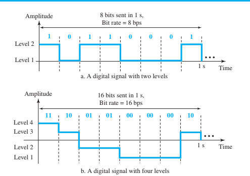 En el ejemplo anterior, la primera señal utiliza 2 niveles y la segunda 4. Número de bits por nivel (señal 1) = Log22; número de bits por nivel (señal 1) = 1. Número de bits por nivel (señal 2) = Log24. Número de bits por nivel (señal 2) = 2.